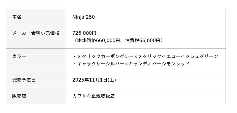株式会社カワサキモータースジャパン(本社:兵庫県明石市、代表取締役社長:佐伯 健児)は、「Ninja 250」のカラー&グラフィックを変更し、2025年11月1日(土)に発売いたします。