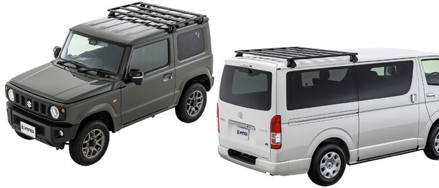 ジムニーは車内が狭いことからルーフラック(ルーフデッキ)の装着率が高い傾向にあります。一方ハイエースも、車中泊のカスタムをしているオーナーなどは車内に荷物を置きたくない要望があります。そこでキャンプ道具以外の荷物も積載するため、フロアパネル(下写真)を当社システムキャリアの「エアロベースバー」と同様の仕様にする事で、様々なアタッチメントが着けられるルーフデッキを開発。またこの2車種は、車種専用設計のローダウンベースキャリアがあり、そのベースの活用により装着時の車高を抑えています。この度新たな試みとして、コストや車体にかかる重量を考慮し、ルーフをフルで覆わないハーフサイズを提案します(2024年市場調査より)。長尺物を積載するハイエースでは、フルサイズもラインアップしています。