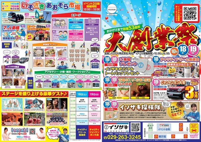 茨城県ひたちなか市を拠点に自動車販売・整備を手がける イソザキ株式会社(本社:茨城県ひたちなか市、代表取締役:磯崎拓紀)は、お客様そして地域の皆さまへの感謝を込めた年に一度の恒例イベント 「イソザキ大創業祭2025」 を、2025 年10 月18 日(土)・19 日(日)の2 日間、本社敷地内で開催します。