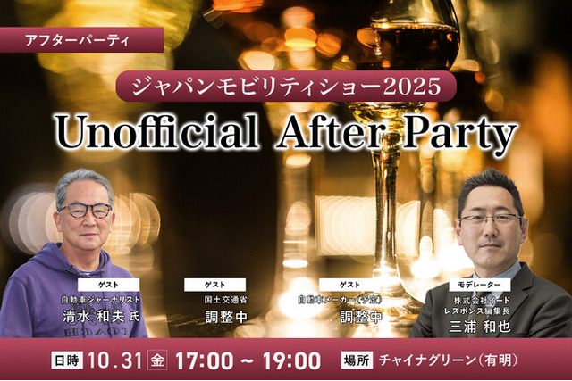 株式会社イード(本社:東京都中野区、代表取締役:宮川 洋)が運営する日本最大級の自動車総合情報プラットフォーム「レスポンス」は、業界関係者同士のさらなる情報交換を目的とした「ジャパンモビリティショー2025」一般公開初日のアフターパーティ「ジャパンモビリティショー2025 Unofficial After Party」を2025年10月31日(金)に開催いたします。イベントで得た最新トレンドを深掘りしつつ、業界のキーパーソンとカジュアルに交流できるビジネスイベントです。