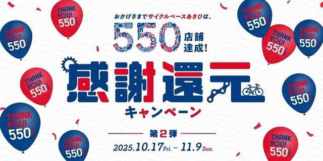 お客様に快適な自転車ライフを提供する株式会社あさひ(以下、あさひ/所在地:大阪市都島区、代表取締役社長:下田佳史)は、運営する店舗数が550店舗を達成したことを記念して、2025年10月17日(金)より「感謝還元キャンペーン第2弾」を全国のサイクルベースあさひ、ならびに公式オンラインストアで実施いたします。