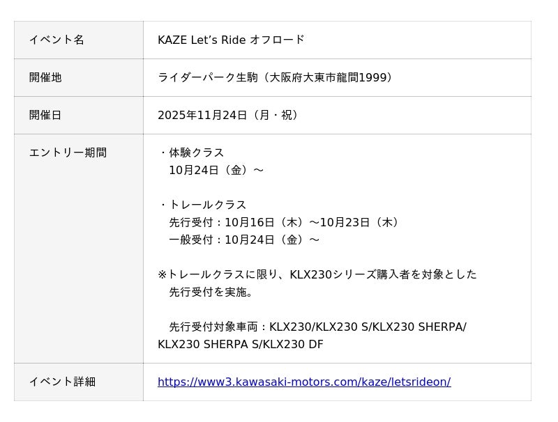 株式会社カワサキモータースジャパン(本社:兵庫県明石市、代表取締役社長:佐伯 健児)は、2025年11月24日(月・祝)にライダーパーク生駒で行われる「KAZE Let’s Ride オフロード」についてお知らせいたします。