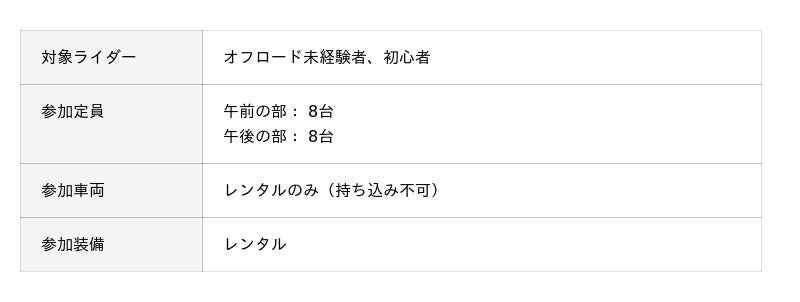 初めてのオフロード大歓迎!オフロードモデルに乗ってみたい方や土の上を走ってみたい方のためのオフロード体験クラス「体験クラス」とトレール車両を所有しているものの、オフロードを走ったことのない方のためのオフロードスタートクラス「トレールクラス」の2クラスを開催。
