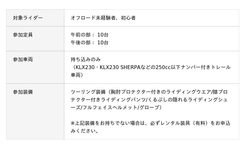 本イベントにご参加いただいた皆さま限定の「オフロードモデル試乗会」も開催を予定しており、カワサキ製オフロードモデルの試乗をお楽しみいただけます。