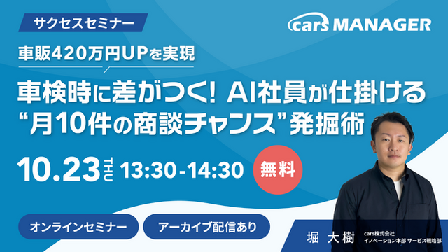 こうした背景を受け、cars株式会社は AIを活用して月10件の商談機会を自動発掘し、車販420万円UPを実現した成功ノウハウ を公開する「cars サクセスセミナー」を開催いたします。