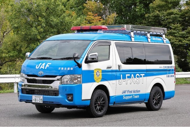 「J-FAST」は、特別支援隊が培ってきた経験とノウハウに加え、全国に広がるJAFロードサービスネットワークを活用し、災害発生後、12時間以内を目安に被災地へ駆けつけ、被害調査・救援・支援活動などをおこなうことを主な目的としています。