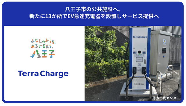 電気自動車(EV)向け充電サービス「Terra Charge(テラチャージ)」を展開するTerra Charge株式会社(本社:東京都港区、代表取締役社長:徳重 徹、以下「当社」)は、2024年11月19日に東京都八王子市と締結した「八王子市電気自動車充電設備整備事業に係る協定」に基づき、市内の公共施設13か所にEV急速充電器を設置し、順次サービス提供を開始します。