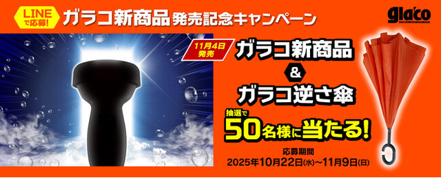 このたび、株式会社ソフト99コーポレーション(代表取締役社長:田中 秀明)は、2025年11月4日(火)に発売予定の「ガラコ新商品」とオリジナルの「ガラコ逆さ傘」のセットが抽選で50名様に当たるプレゼントキャンペーンを、2025年10月22日(水)より開催いたします。