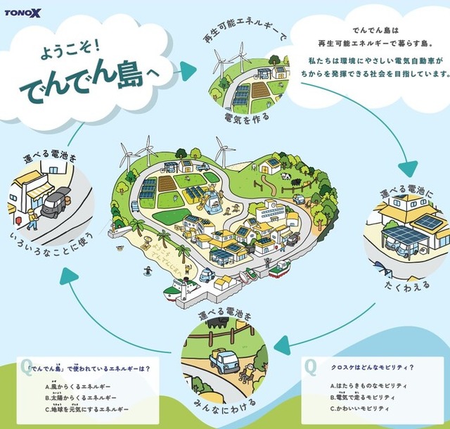 弊社は、“電気自動車だからできること”を実現する製品の設計・開発に取り組んでいます。社会のための製品、サービスのための製品という視点で、モビリティの新しい価値を提案していくことを目指しています。現在は、送電線インフラのない仮想の島「でんでん島」を設定し、モビリティとエネルギーを手軽に連携させる“運べる電池”の活用を検討しています。現実の世界でも離島や過疎地など、「でんでん島」に近い環境が存在しており、今後は実際の製品を用いた実証へ進めていきたいと考えています。