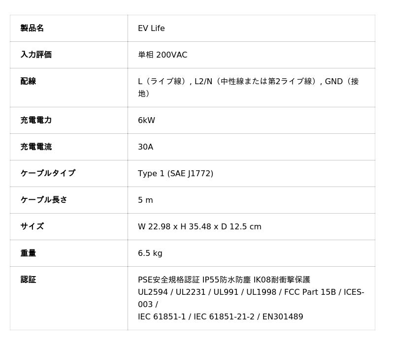 - 5mのType 1(SAE J1772)ケーブルを標準装備
