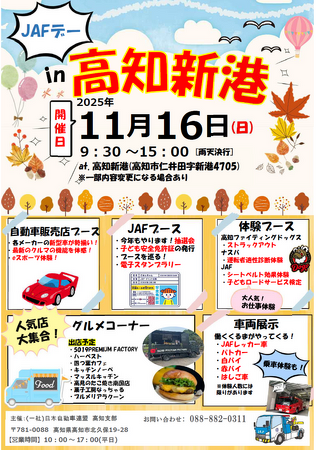 JAF(一般社団法人日本自動車連盟)高知支部(支部長 佐藤 誠三)は、11月16日(日)「高知新港」(高知市仁井田字新港4705)においてJAFデーを開催します。