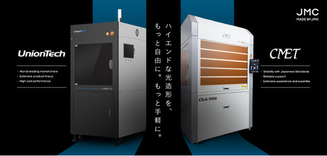 株式会社JMC(神奈川県横浜市、代表取締役社長兼CEO:渡邊 大知)は、CMET(シーメット)株式会社(神奈川県横浜市、代表取締役社長:石山 重寿)製3Dプリンター、ならびに上海聯泰科技股份有限公司(UnionTech/ユニオンテック)(中国・上海)製3Dプリンターについて、販売を新たに開始いたします。なお、UnionTech社製品については、日本国内で唯一の取扱企業である株式会社日本未来技研(東京都渋谷区、代表取締役:杉本 美佳)と連携することで、導入支援からアフターフォローまで一貫して提供いたします。