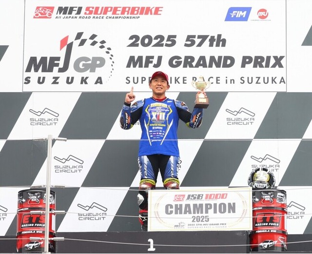 2025 年10月26日(日)に鈴鹿サーキットにおいて、シリーズ最終戦となる「2025 MFJ全日本ロードレース選手権シリーズ 第7戦 第57回MFJグランプリ スーパーバイクレースin鈴鹿」が開催され、国内最高峰クラスのJSB1000クラスで年間チャンピオンに輝いた中須賀 克行(なかすが かつゆき)選手に、文部科学省より「文部科学大臣杯」が授与されました。 2025 年は多くのライダーが激戦を繰り広げる苛烈なトップ争いが展開されたシーズンとなりましたが、その猛追を退け、抜群の安定感で2年ぶりに年間チャンピオンの座を奪還しました。中須賀選手は今シーズン 10 レース中 5勝をあげ、最高峰クラスにおいて自身13度目の年間チャンピオン獲得となります。