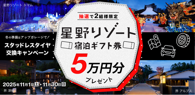 カー&バイク用品のリユース専門店「アップガレージ」を全国展開する株式会社アップガレージグループ(本社:神奈川県横浜市、代表取締役社長:河野映彦、東証スタンダード市場:7134)は、2025年11月1日(土)から2025年11月30日(日)の間、星野リゾート宿泊ギフト券が当たる!スタッドレスタイヤ交換キャンペーンを実施します。