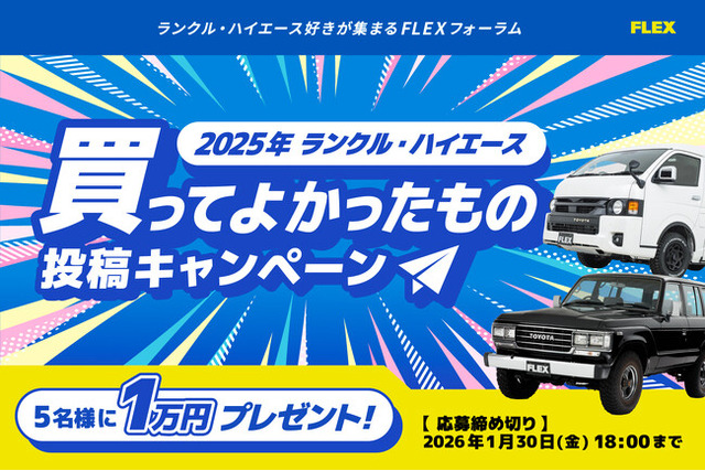 フレックス株式会社(本社:東京都、代表取締役:藤崎 孝行)は、2025年10月31日(金)より、ランドクルーザーおよびハイエースのオーナーを対象とした「ランクル・ハイエース 2025年買ってよかったもの投稿キャンペーン」を開催いたします。