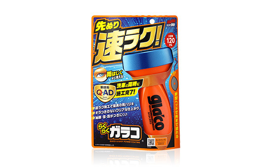 これまで実現が困難であった洗車の前に塗ってから洗うという『らくらくガラコ』の施工方法を可能にしたのが、新技術の「Q-AD(Quick Adhesion&Dry)」。塗り込みと同時に高速密着成分(QA)と速乾処方(QD)の効果で、強力な撥水成分がガラス面へすぐに強密着。シャンプー洗車にも耐え、余剰成分だけが洗車で洗い流されるためすすいだ直後から強力な撥水性能を発揮します。