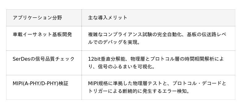 本ソリューションは、高機能・高精度なオシロスコープと高速インターコネクトアナライザーであるTDR、さらに自動テストソフトウェアを組み合わせた統合テストソリューションです。ADAS(先進運転支援システム)やコネクテッドカーの進化に不可欠な車載ネットワークの開発・製造において、単なる規格の合否判定にとどまらず、不合格の根本原因を迅速に特定する高度なデバッグ機能を提供します。これにより、エンジニアの開発プロセスを効率化し、次世代自動車の品質の向上と市場投入の加速に貢献します。