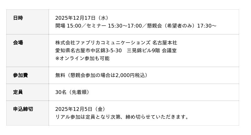 株式会社ファブリカホールディングスの完全子会社、株式会社ファブリカコミュニケーションズ(本社:愛知県名古屋市、代表取締役社長:谷口政人)は、中古車販売事業者向けに、生成AIを活用した実務改善をテーマとする「AI活用セミナー」を2025年12月17日(水)に名古屋本社およびオンラインで同時開催いたします。
