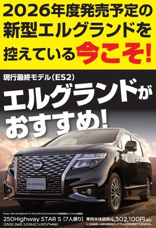日産東京販売株式会社(本社:東京都品川区 代表取締役社長:菊地 文夫)は、日産が誇るミニバンのフラッグシップ「エルグランド」で、新型の発表を控える今だからこそ、現行型最終モデルE52でお得にエルグランドブランドをお楽しみいただける2つのプラン「乗りかえ決定版」をご用意しました。