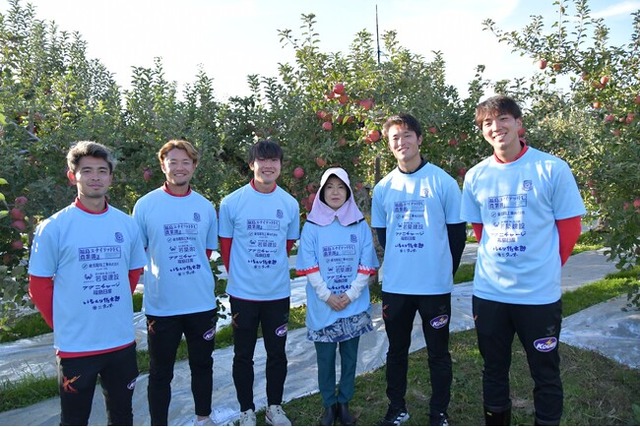 福島日産は、福島ユナイテッドFCのオフィシャルパートナーおよびSDGsユニフォーパートナーとして、SDGsにおける共創活動の推進を行っております。その取り組みの一環として、11月6日(木)に鈴直樹選手、野末学選手、柴田徹選手、當麻颯選手、田中雄大選手にご参加いただき、伊達市のりんご農家にてりんごの収穫作業を行いました。