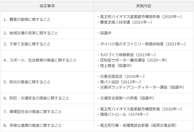 竜王町が今年町制70周年、ダイハツは昨年第1地区で開設50周年、第2地区で同35周年という節目を迎えたことを機に、両者の連携を一層強化すべく、包括連携協定を締結しました。この協定により、さらに幅広い分野での連携が可能となり、8つの協定事項について協働・共創の取組みを推進することにより、竜王町内の地域活性化および住民サービスの向上を図ります。