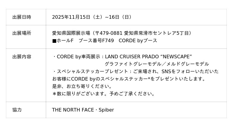 このたびCORDE byは、2025年11月15日(土)~16日(日)に開催される「FIELDSTYLE EXPO 2025」(愛知県国際展示場)への出展も決定いたしました。本イベントでは、「Japan Mobility Show2025」で話題を集めたLAND CRUISER PRADO “NEWSCAPE” GRAPHITE GRAY MODEL(グラファイトグレーモデル)だけでなく、MELDE GRAY MODEL(メルドグレーモデル)の2モデルを一般向けに初めて同時展示いたします。都市と自然のグラデーションを象徴する2つのモデルを、実際に“見て・感じる”ことができる貴重な機会です。