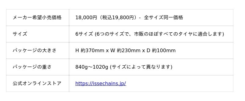 イッセ・スノーソックス リサイクルは、全国のカー用品量販店様をはじめオンラインショップで販売しています。[表: https://prtimes.jp/data/corp/52969/table/18_1_93213ed9bf0972a978877c4da91dc826.jpg?v=202511141221 ]