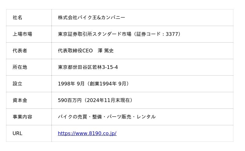 株式会社バイク王&カンパニーは、1994年9月に「バイクライフのあらゆるサービスと、バイクにつながる周辺事業を展開し、バイクライフを超えたライフデザイン企業」として創業。中古バイクの買取・販売を主力事業とし全国に店舗を展開、バイクの売買・整備・パーツ販売・レンタルなど、バイクライフを総合的にサポートしています。近年は、中古バイクだけでなく、新車販売、パーツ・用品販売、レンタルバイク、さらには中古車(四輪車)や電動モビリティなど、バイクライフを超えた幅広いモビリティ関連事業へと領域を拡大しています。