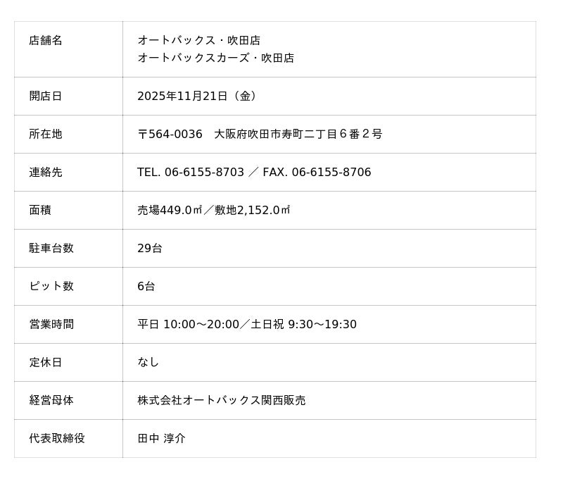 株式会社オートバックスセブン(代表取締役 社長:堀井勇吾)と加盟店契約を結んでいる株式会社オートバックス関西販売(代表取締役:田中淳介)は、2025年11月21日(金)に「オートバックス・吹田(すいた)店」および「オートバックスカーズ・吹田店」を新規オープンいたします。
