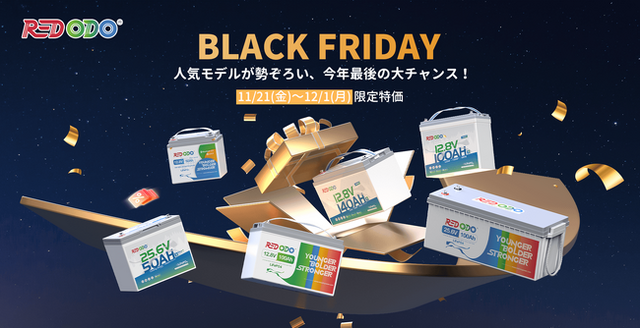 Redodo(レッドオド)は、2025年Amazonブラックフライデーに合わせ、11月24日(月)0:00から12月1日(月)23:59まで、高性能リン酸鉄リチウムイオン(LiFePO₄)バッテリー、充電器、インバーター、MPPT太陽光充電コントローラーなどを年間最低価格で販売します。このセールは、オフグリッド生活やキャンピングカーユーザーにとって、長寿命・安全性の高い製品をお得に手に入れる絶好の機会です。