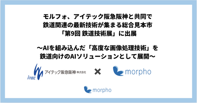 株式会社モルフォ(本社 : 東京都千代田区、代表取締役社長:平賀 督基、東証グロース市場:3653、以下 : モルフォ)は、2025年11月26日(水)から29日(土)までの4日間、幕張メッセで開催される「第9回鉄道技術展 Mass-Trans Innovation Japan 2025」において、モルフォの要素技術を搭載した製品を、アイテック阪急阪神株式会社(本社:大阪市福島区、代表取締役社長:水本好信、以下:アイテック阪急阪神)のブースにて共同出展します。