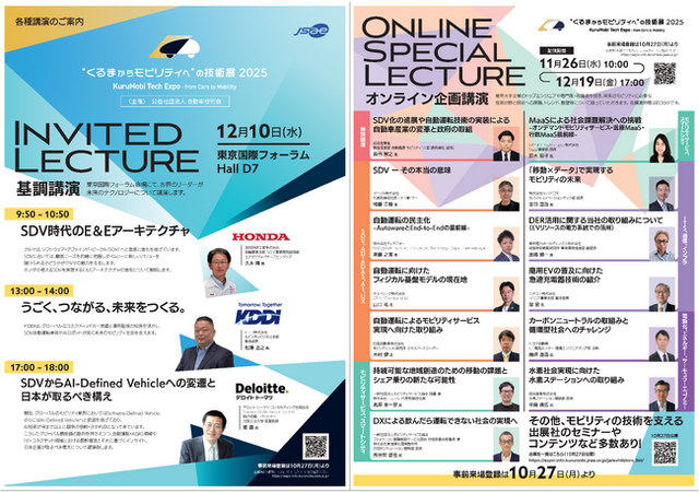 本年は特に、ソフトウェア定義型車両(SDV)、自動運転・ADAS、AI・UX、スマートシティ、通信インフラ、エネルギー・LCA、サーキュラーエコノミーといった重点テーマを設定し、第一線の専門家による講演を予定しています。