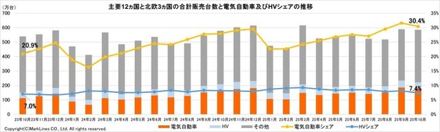 主要12カ国とノルウェー、スウェーデン、フィンランドの北欧3カ国(計15カ国)における10月の電気自動車販売台数は178.3万台だった。前月比で4.3%減少したが、前年同月比では10.5%増加した。また、10月の電気自動車シェアは30.4%で、前月比で1.2ポイント減、前年同月比では2.5ポイント増加した。2025年1-10月の電気自動車累計販売台数は、前年同期比22.9%増の1,449.1万台で、自動車販売台数全体に占めるシェアは26.9%となった。