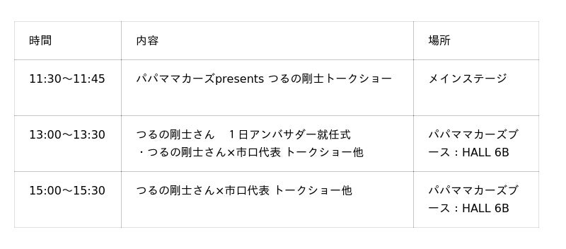 パパママカーズは、ららぽーと堺店、ららぽーと湘南平塚店など、ショッピングモール内に店舗を展開。女性や家族が気軽に立ち寄れる明るい雰囲気の中で、「お気に入りの服を選ぶように、車の色を選べる」という新しいカーライフスタイルを提案。今回の初出展に際して、子育て世代から絶大な支持を集める"パパ代表"として、キャンプ・釣りなど家族でのアウトドアライフを満喫して「家族との時間」や「外遊び」を大切にする、つるの剛士さんからパパママカーズのコンセプトをPRしていただく事でパパママカーズの世界観を会場および多くの皆様に知ってもらうきっかけになればと思っています。12/6(土)つるの剛士さん 出演予定