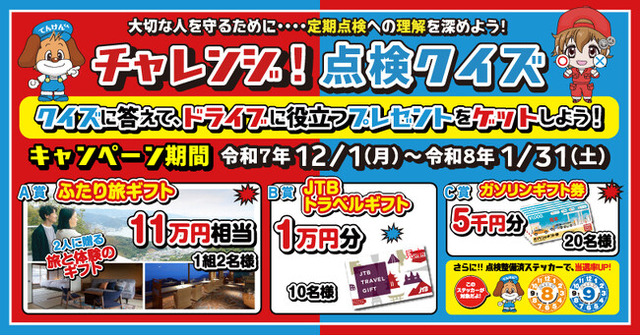 近畿地区自動車整備連絡協議会(代表:大阪市住之江区南港東3-5-6、会長:城谷忠)は、近畿地区2府4県の自動車ユーザーを対象に、”クルマの定期点検の重要性”をわかりやすく啓蒙することを目的とした、”大切な人を守るために...クルマの定期点検への理解を深めよう!「チャレンジ!点検Quizキャンペーン」”の第2弾を、2025年12月1日(月)~2026年1月31日(土)の期間で開催いたします。