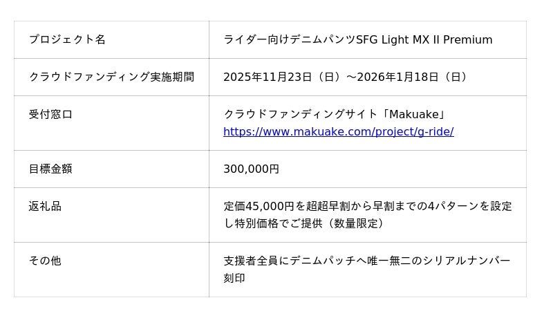 熊本を拠点とするモーターサイクルギアブランドG RIDE(ジー ライド本社:熊本県熊本市)は、昨年11月23日より実施した新たなデニムライン《SFG Light MX II Premium》が応援購入者が70名超、最上位プラン超超早割は完売し達成率850%を突破、いよいよ最終期限2026年1月18日までとなることをお知らせします。