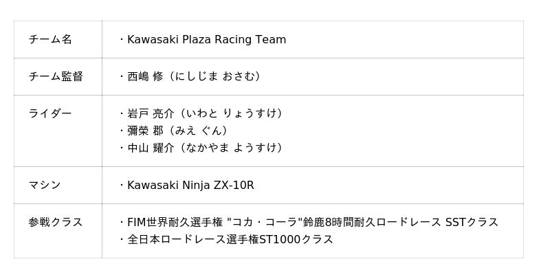株式会社カワサキモータースジャパン(本社:兵庫県明石市、代表取締役社長:佐伯 健児)は、「Kawasaki Plaza Racing Team」へ岩戸 亮介、彌榮 郡を起用し「FIM世界耐久選手権 "コカ・コーラ"鈴鹿8時間耐久ロードレース SSTクラス」および「全日本ロードレース選手権 ST1000クラス」に参戦いたします。