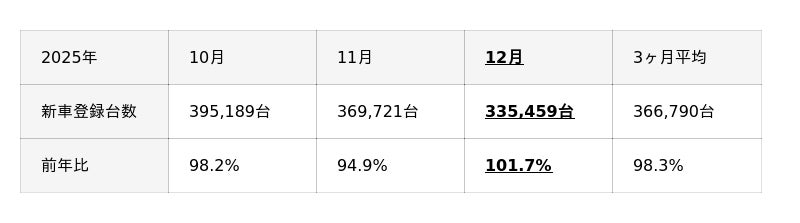 株式会社ファブリカホールディングスの完全子会社、株式会社ファブリカコミュニケーションズ(本社所在地:愛知県名古屋市中区、代表取締役社長CEO:谷口 政人)が運営する中古車情報サイト「車選びドットコム」は、2025年12月の新車・中古車登録台数の推移および当サイトの販売台数推移をもとに中古車市場の動きをまとめた『中古車市場統計レポート』をご案内いたします。