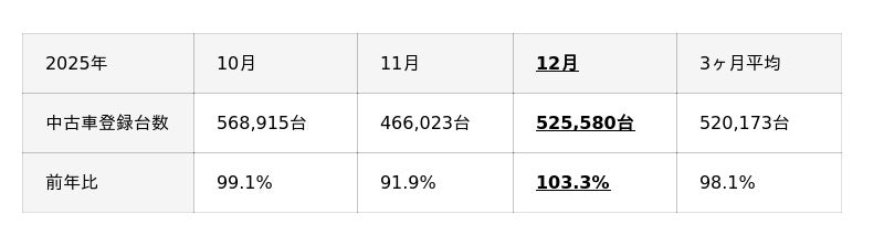 【中古車市場統計レポート(2025年12月)】より抜粋してご案内いたします。