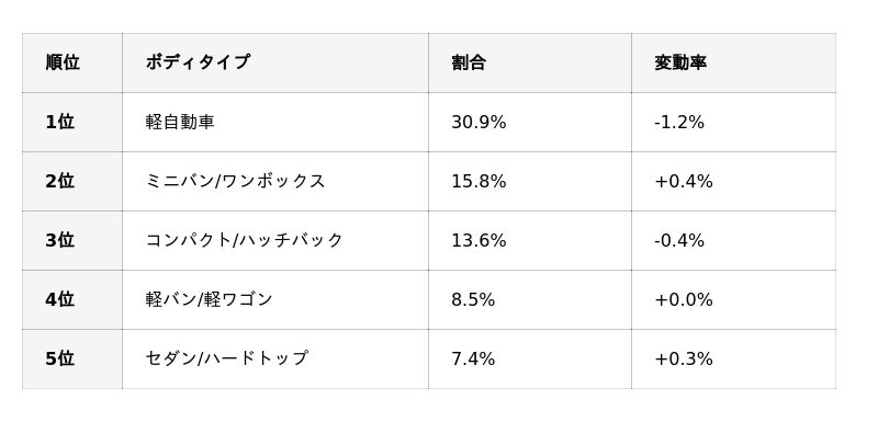 国産車のボディタイプ別ランキングでは、軽自動車が1.2ポイントほどシェアを落としましたが、依然として1位を維持しています。また11月にシェアを伸ばしていたコンパクト/ハッチバックが0.4ポイントシェアを落としています。