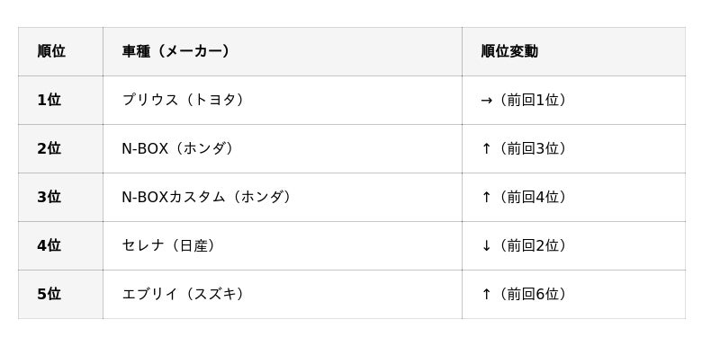 車種別販売ランキング