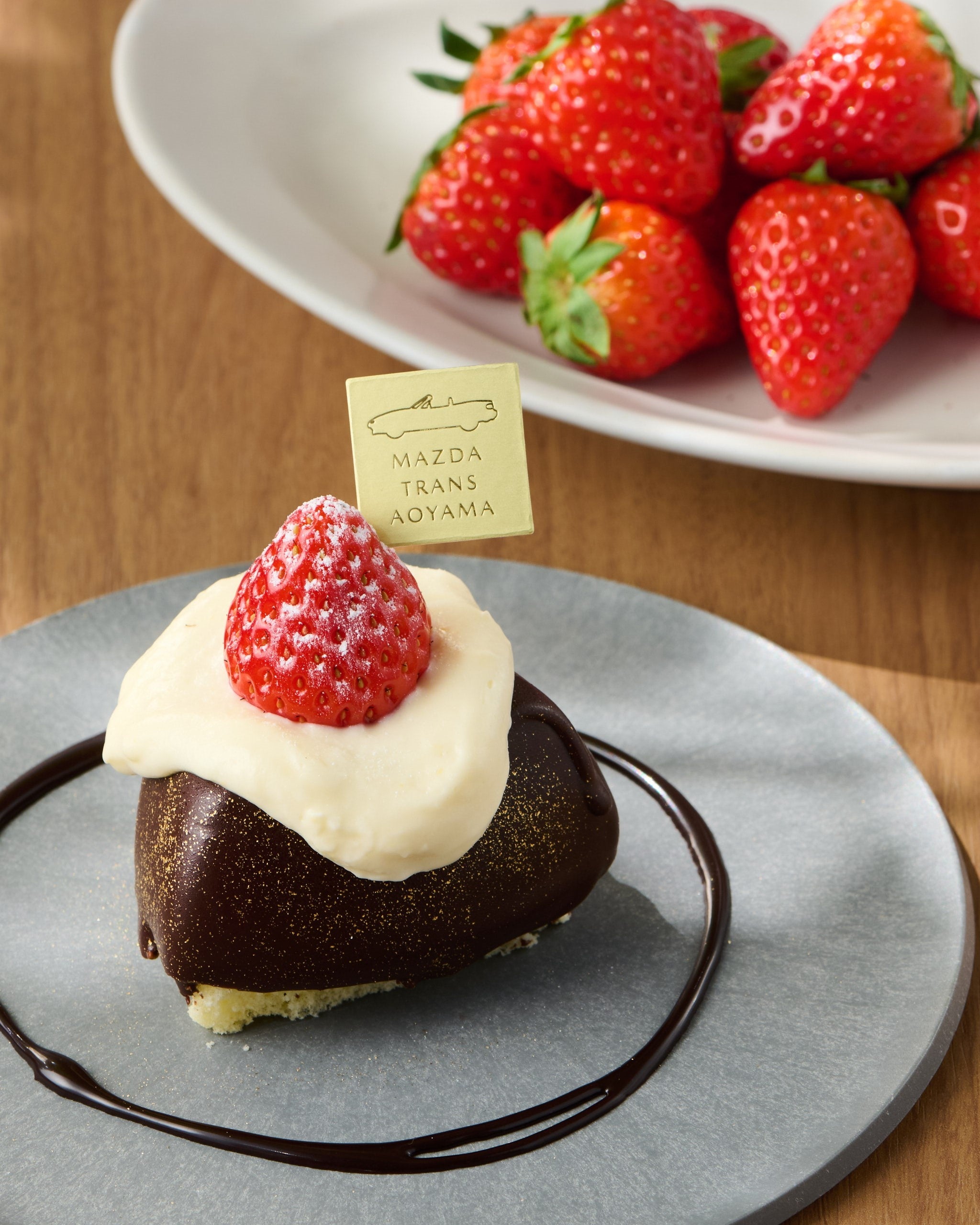 開設1周年を記念し、ロータリーエンジンの形をモチーフにした「ロータリーケーキ」が登場。濃厚なチョコレートムースケーキに、八天堂のカスタードクリームと旬のいちごを合わせた、ここでしか味わえない限定メニューです。是非ご賞味ください。