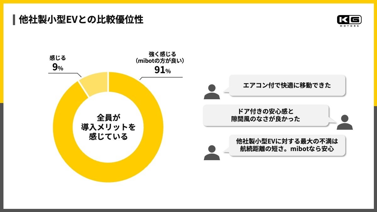 既存の他社製小型EVと比較した場合、回答者の91%がmibotの優位性を「強く感じる」と回答しました。特に、エアコンによる快適性やドア付き構造による安心感、航続距離への安心感が評価要素として挙げられています。