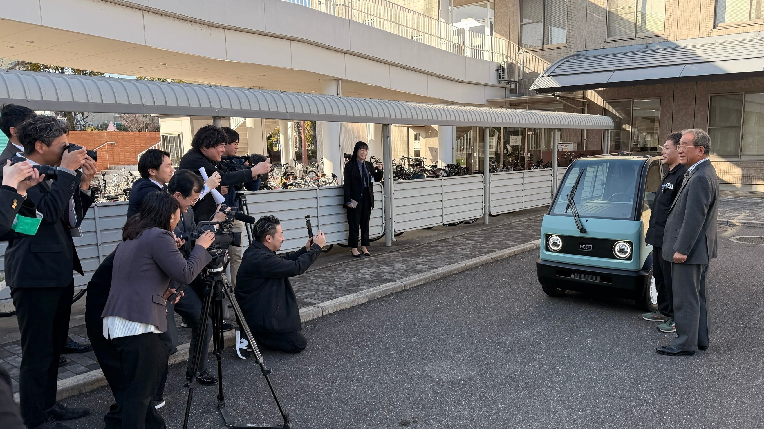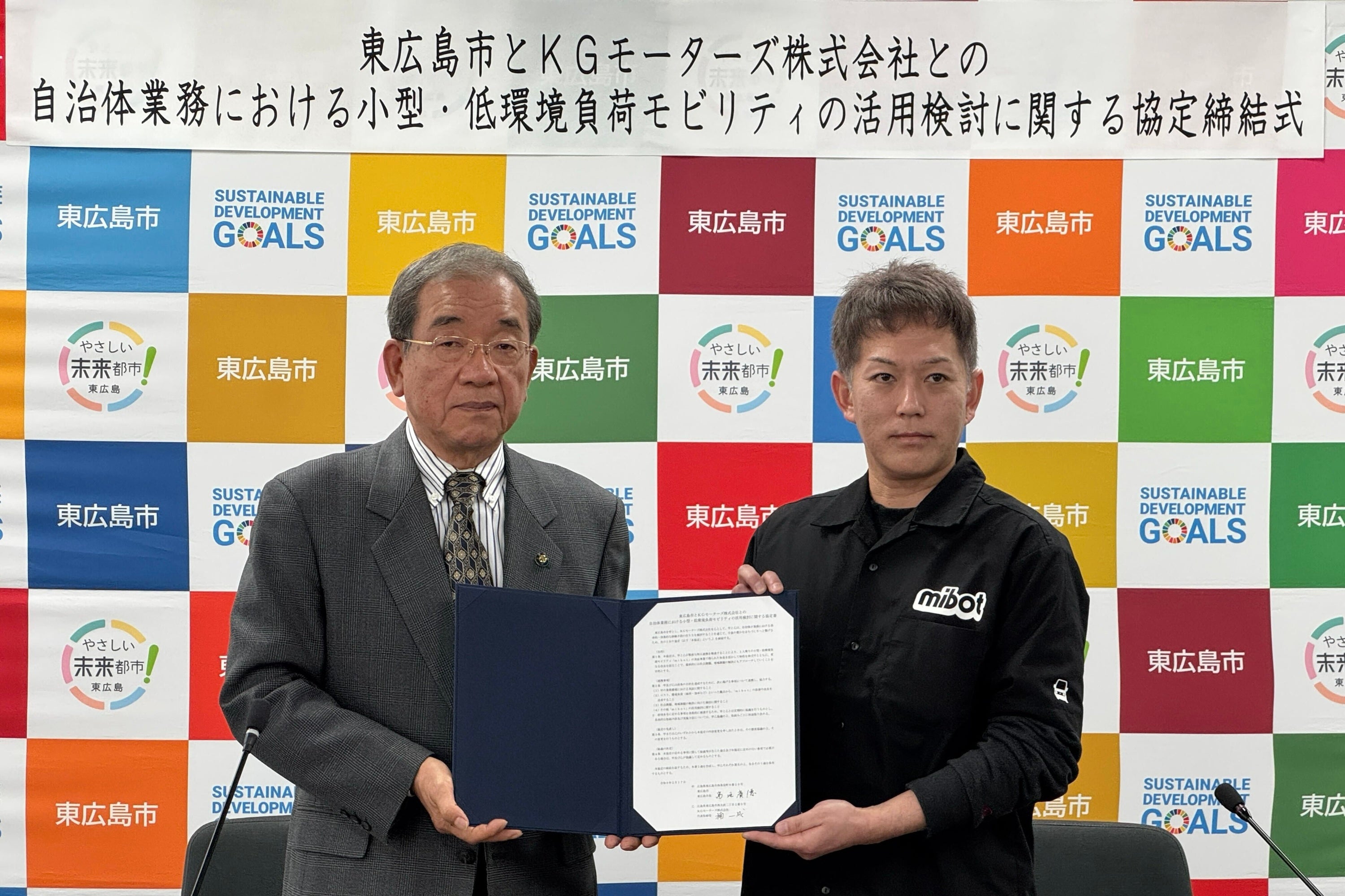 [画像7: https://prcdn.freetls.fastly.net/release_image/112621/30/112621-30-ab5488f494d2a7ae1912fb64ac2d862e-2633x1481.jpg?width=536&quality=85%2C75&format=jpeg&auto=webp&fit=bounds&bg-color=fff ]東広島市とKGモーターズの協定締結式後、mibot前で報道陣の取材に応じる様子