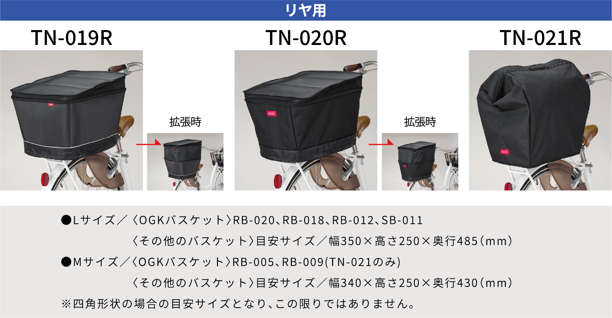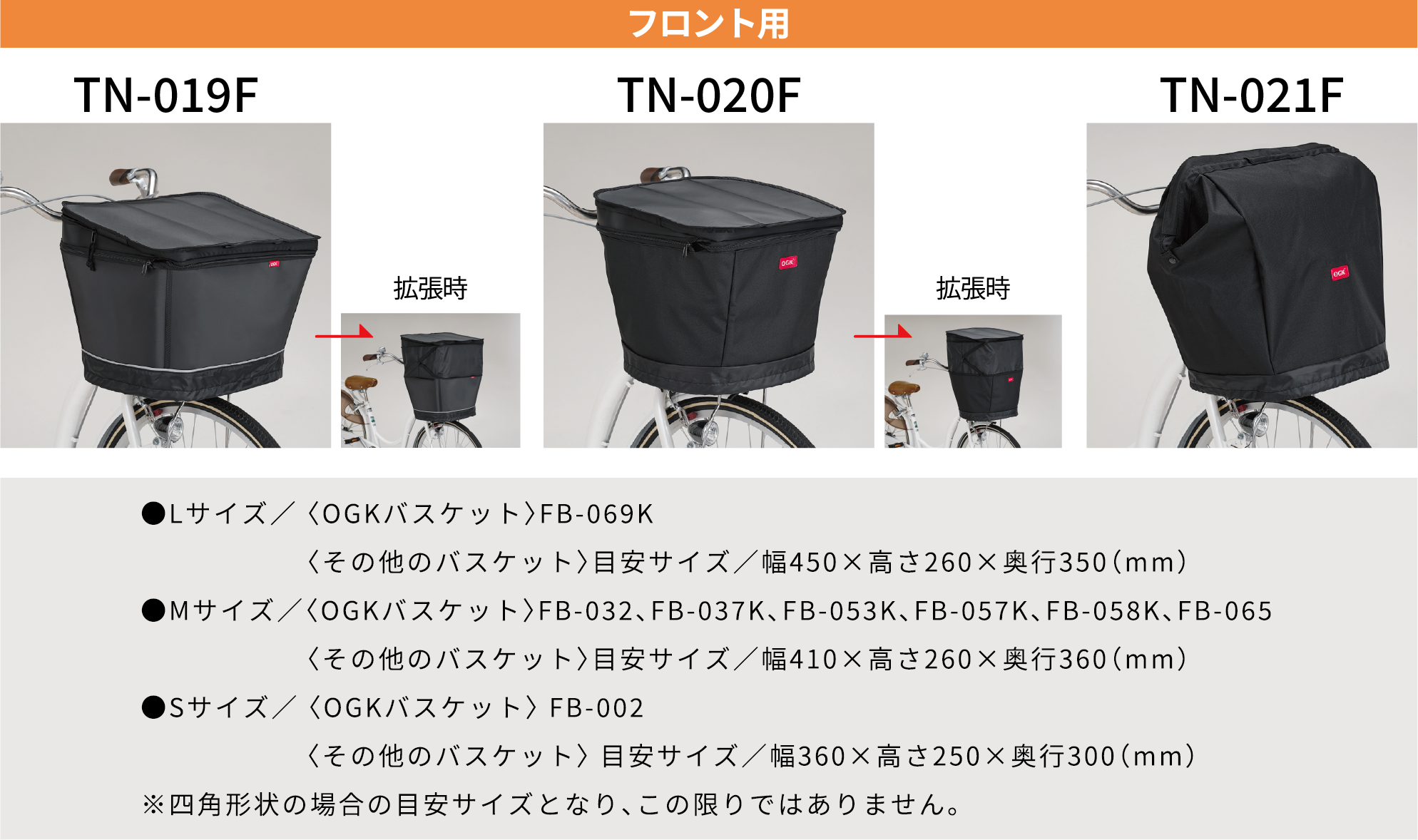 バスケットカバー「TN-019・TN-020」は、ファスナーを開くだけで容量が約1.6倍にアップする2段式で、買い物などで荷物が増えても安心です。耐久性と保形性が高く、水を通さない素材を採用し、水が流れやすい形状で中の荷物を濡らしません。「TN-021」は、上部が大きく開いて荷物の出し入れがより快適になる仕様です。雨の日も自転車での送迎が欠かせない子育て世代には、当社チャイルドシートの純正レインカバーが好評で、純正のバスケットカバーもほしいという声にも応えます。長年自転車用品を取り扱っている中で寄せられたユーザーの困りごとを参考に、細かい配慮にこだわっています。