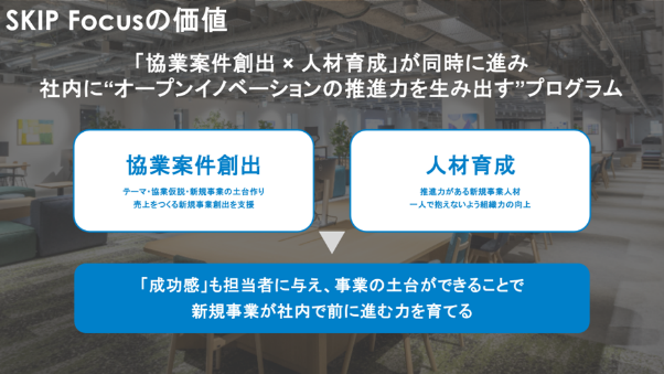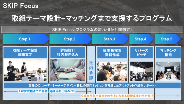 SKIP Focusは、企業の課題整理から協業テーマ設計、協業先探索・マッチングまでを約6か月間、ワークショップと伴走支援を通して一気通貫でSTATION Aiが支援するオープンイノベーションプログラムです。