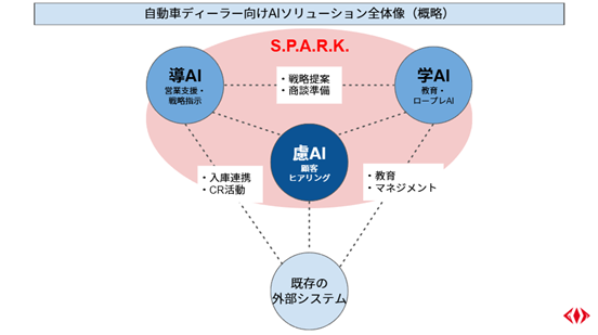 音声対話型AIプロダクト「S.P.A.R.K.」は、発話内容に加え、声のトーンや間、抑揚といった非言語情報を解析し、顧客自身も言語化できていない潜在的な意図(インサイト)の可視化が可能です。目的が曖昧な状態においてもAIが問いかけを行うことで、対話をリードします。この「S.P.A.R.K.」のプラットフォームに、顧客ヒアリングや営業支援などの機能を持つAIソリューションを構築することで、業務効率化と顧客インサイトの可視化を実現します。