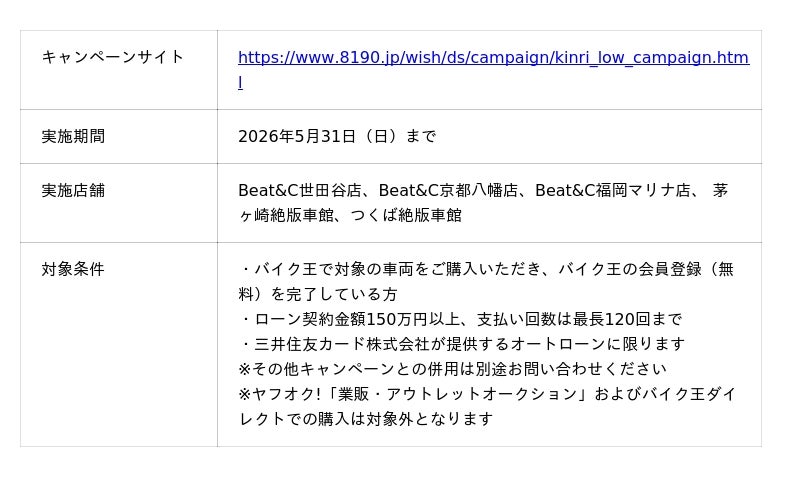 「常識を壊し、新たな価値と感動を生む」を企業理念に掲げ、「バイクライフの生涯パートナー」を目指す株式会社バイク王&カンパニー(代表取締役CEO:澤 篤史、本社:東京都世田谷区、証券コード:3377、以下「当社」)は、5月31日(日)までの期間、Beat&Cおよび絶版車館で対象のバイクをご購入の方に、実質年率1.9%の低金利ローンをご提供いたします。