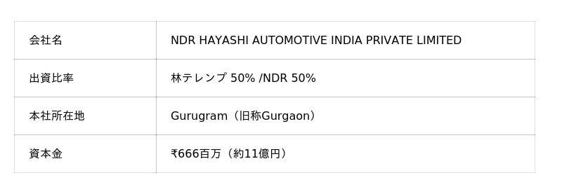 本合弁事業は、林テレンプが長年培ってきた自動車内装分野における技術力と、NDR Auto Components社が有するインド市場での事業基盤・ネットワークを融合することで、競争力の高い製品開発と安定した供給体制の構築を目的としています。