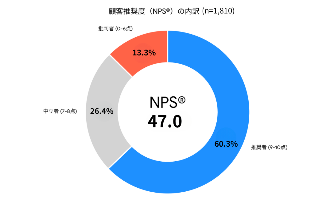その結果、顧客推奨度を示すNPS(R)(ネットプロモータースコア)において、業界平均を圧倒する「47.0」を記録。利用者の約3人に2人(60.3%)が「知人や家族に強く勧めたい」と回答しました。
